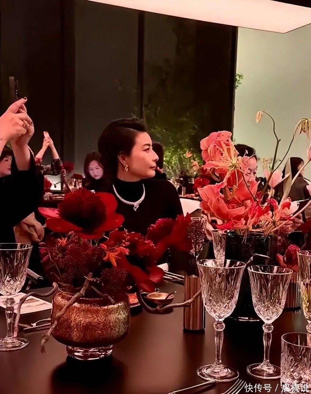 一袭墨绿色真丝上衣配搭黑色蕾丝深V长裙,端坐席间气场全开。
